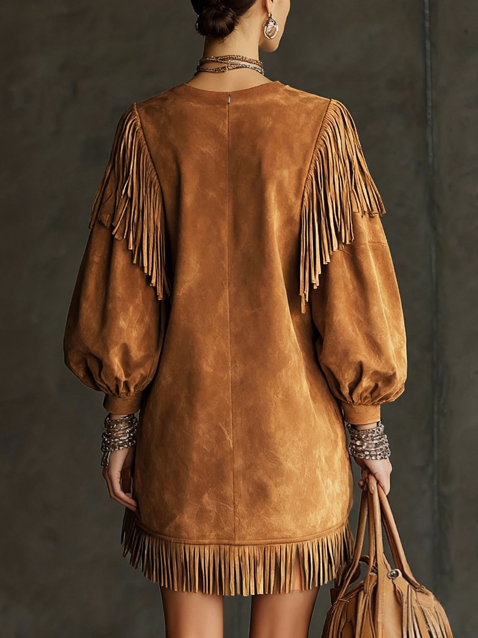 Featuring statement bell sleeves and fringe detailing, this dress captures the essence of boho-Western style with an effortlessly cool vibe. Perfect for a day out or a night of fun, its relaxed fit ensures you stay comfortable, while its bold design turns heads wherever you go. Pair it with boots for an iconic look.